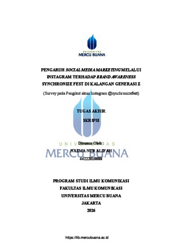 ALIFAH, NAZMA NUR (2026) PENGARUH SOCIAL MEDIA MARKETING MELALUI INSTAGRAM TERHADAP BRAND AWARENESS SYNCHRONIZE FEST DI KALANGAN GENERASI Z (Survey pada Pengikut akun Instagram @synchronizefest). S1 thesis, Universitas Mercu Buana Jakarta.