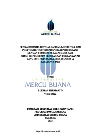 HERMANTO, LUKMAN (2022) PENGARUH INTELLECTUAL CAPITAL, LIKUIDITAS, DAN PROFITABILITAS TERHADAP NILAI PERUSAHAAN DENGAN FIRM SIZE SEBAGAI MODERASI (STUDI EMPIRIS PADA PERUSAHAAN PERBANKANAN YANG LISTING DI BURSA EFEK INDONESIA TAHUN 2018-2020). S2 thesis, Universitas Mercu Buana Jakarta.