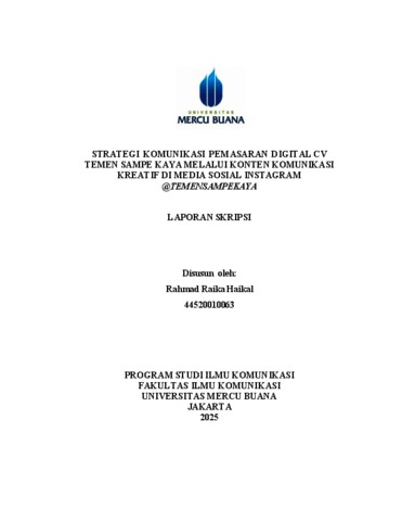 Haikal, Rahmad Raika (2025) STRATEGI KOMUNIKASI PEMASARAN DIGITAL CV TEMEN SAMPE KAYA MELALUI KONTEN KOMUNIKASI KREATIF DI MEDIA SOSIAL INSTAGRAM @TEMENSAMPEKAYA. S1 thesis, Universitas Mercu Buana Jakarta - Menteng.