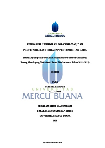 FIRANDA, AGHISTA (2025) PENGARUH LIKUIDITAS, SOLVABILITAS, DAN PROFITABILITAS TERHADAP PERTUMBUHAN LABA (Studi Empiris pada Perusahaan Manufaktur SubSektor Pakaian dan Barang Mewah yang Terdaftar di Bursa Efek Indonesia Tahun 2019 - 2023). S1 thesis, UNIVERISTAS MERCU BUANA - BUNCIT.