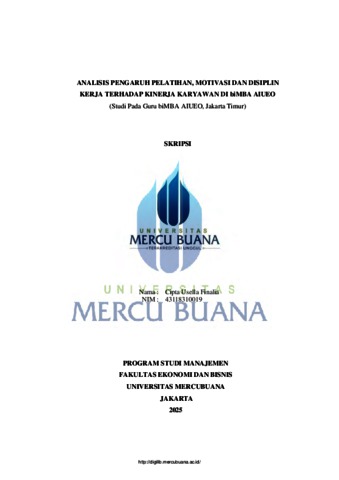 Finalia, Cipta Usella (2025) ANALISIS PENGARUH PELATIHAN, MOTIVASI DAN DISIPLIN KERJA TERHADAP KINERJA KARYAWAN DI biMBA AIUEO (Studi Pada Guru biMBA AIUEO, Jakarta Timur). S1 thesis, UNIVERISTAS MERCU BUANA - BUNCIT.