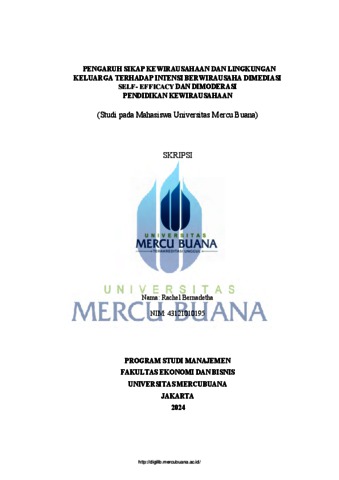 Bernadetha, Rachel (2025) PENGARUH SIKAP KEWIRAUSAHAAN DAN LINGKUNGAN KELUARGA TERHADAP INTENSI BERWIRAUSAHA DIMEDIASI SELF- EFFICACY DAN DIMODERASI PENDIDIKAN KEWIRAUSAHAAN (Studi pada Mahasiswa Universitas Mercu Buana). S1 thesis, UNIVERISTAS MERCU BUANA - BUNCIT.