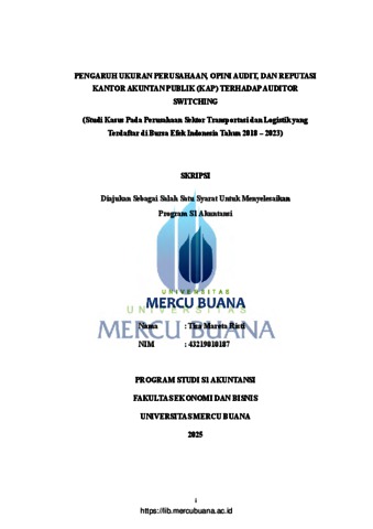 RISTI, TISA MARETA (2025) PENGARUH UKURAN PERUSAHAAN, OPINI AUDIT, DAN REPUTASI KANTOR AKUNTAN PUBLIK (KAP) TERHADAP AUDITOR SWITCHING (Studi Kasus Pada Perusahaan Sektor Transportasi dan Logistik yang Terdaftar di Bursa Efek Indonesia Tahun 2018 - 2023). S1 thesis, Universitas Mercu Buana Jakarta.