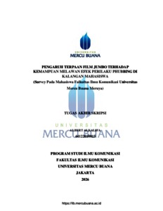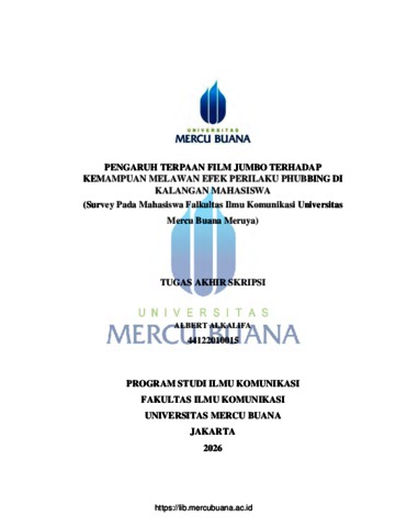 ALKALIFA, ALBERT (2026) PENGARUH TERPAAN FILM JUMBO TERHADAP KEMAMPUAN MELAWAN EFEK PERILAKU PHUBBING DI KALANGAN MAHASISWA (Survey Pada Mahasiswa Falkultas Ilmu Komunikasi Universitas Mercu Buana Meruya). S1 thesis, Universitas Mercu Buana Jakarta.