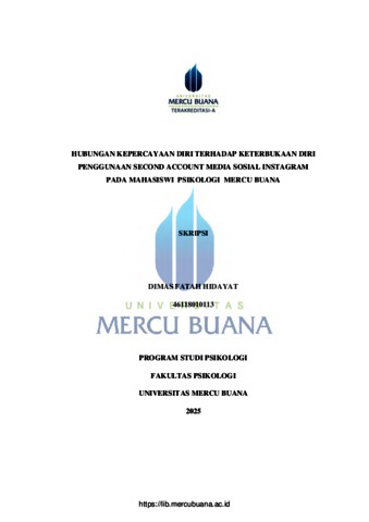 HIDAYAT, DIMAS FATAH (2025) HUBUNGAN KEPERCAYAAN DIRI TERHADAP KETERBUKAAN DIRI PENGGUNAAN SECOND ACCOUNT MEDIA SOSIAL INSTAGRAM PADA MAHASISWI PSIKOLOGI MERCU BUANA. S1 thesis, Universitas Mercu Buana Jakarta.
