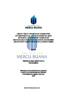 HESTANTA, THOMAS EKO (2025) GREEN TRUST MEMEDIASI MARKETING ENVIRONMENTAL, ENERGI EFISIENSI, DAN BUILDING ATMOSPHERE TERHADAP SUSTAINABLE PURCHASE DECISION KONSUMEN APARTEMEN GREEN BUILDING JABODETABEK. S2 thesis, Universitas Mercu Buana Jakarta.