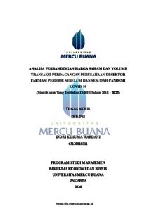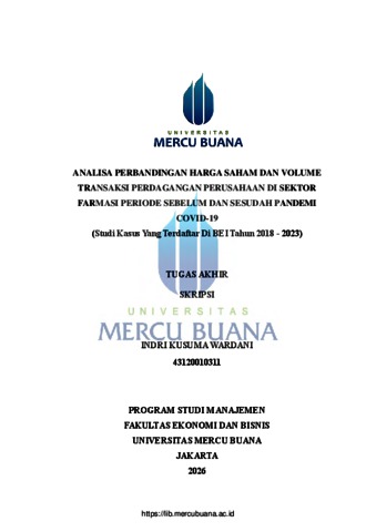WARDANI, INDRI KUSUMA (2025) ANALISA PERBANDINGAN HARGA SAHAM DAN VOLUME TRANSAKSI PERDAGANGAN PERUSAHAAN DI SEKTOR FARMASI PERIODE SEBELUM DAN SESUDAH PANDEMI COVID-19 (Studi Kasus Yang Terdaftar Di BEI Tahun 2018-2023). S1 thesis, Universitas Mercu Buana Jakarta.