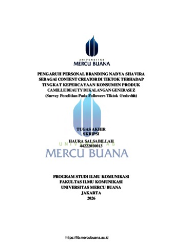 SALSABILLAH, HAURA (2026) PENGARUH PERSONAL BRANDING NADYA SHAVIRA SEBAGAI CONTENT CREATOR DI TIKTOK TERHADAP TINGKAT KEPERCAYAAN KONSUMEN PRODUK CAMILLE BEAUTY DI KALANGAN GENERASI Z (Survey Penelitian Pada Followers Tiktok @ndsvhh). S1 thesis, Universitas Mercu Buana Jakarta.