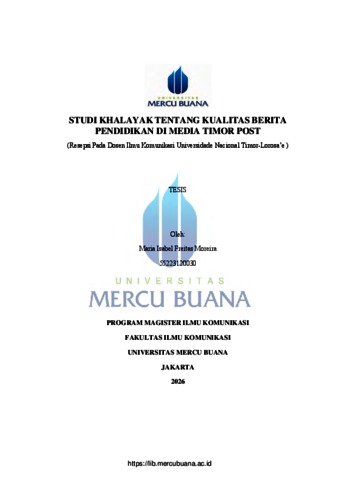 MOREIRA, MARIA ISABEL F. (2026) STUDI KHALAYAK TENTANG KUALITAS BERITA PENDIDIKAN DI MEDIA TIMOR POST (Resepsi Pada Dosen Ilmu Komunikasi Universidade Nacional Timor-Lorosa'e ). S1 thesis, Universitas Mercu Buana Jakarta.