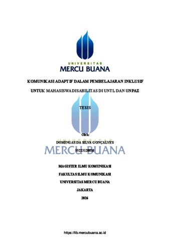 GONCALVES, DOMINGAS DA SILVA (2026) KOMUNIKASI ADAPTIF DALAM PEMBELAJARAN INKLUSIF UNTUK MAHASISWA DISABILITAS DI UNTL DAN UNPAZ. S2 thesis, Universitas Mercu Buana Jakarta.