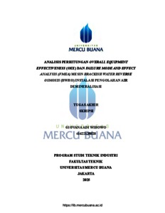 WIBOWO, GIOVANA ADI (2026) ANALISIS PERHITUNGAN OVERALL EQUIPMENT EFFECTIVENESS (OEE) DAN FAILURE MODE AND EFFECT ANALYSIS (FMEA) MESIN BRACKISH WATER REVERSE OSMOSIS (BWRO) INSTALASI PENGOLAHAN AIR DEMINERALISASI. S1 thesis, Universitas Mercu Buana Jakarta.