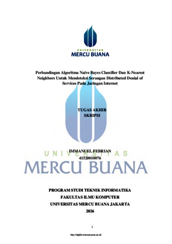 FEBRIAN, IMMANUEL (2026) Perbandingan Algoritma Naive Bayes Classifier Dan K-Nearest Neighbors Untuk Mendeteksi Serangan Distributed Denial of Services Pada Jaringan Internet. S1 thesis, UNIVERISTAS MERCU BUANA - BUNCIT.