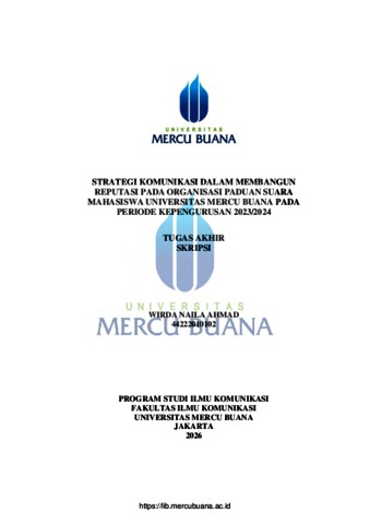 AHMAD, WIRDA NAILA (2026) STRATEGI KOMUNIKASI DALAM MEMBANGUN REPUTASI PADA ORGANISASI PADUAN SUARA MAHASISWA UNIVERSITAS MERCU BUANA PADA PERIODE KEPENGURUSAN 2023/2024. S1 thesis, Universitas Mercu Buana Jakarta.