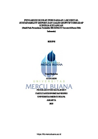 SIMBOLON, TENNI (2025) PENGARUH UKURAN PERUSAHAAN, LIKUIDITAS, SUSTAINABILITY REPORT, DAN SALES GROWTH TERHADAP KINERJA KEUANGAN (Studi Pada Perusahaan Terindeks SRI-KEHATI Tercatat di Bursa Efek Indonesia). S1 thesis, Universitas Mercu Buana Jakarta.