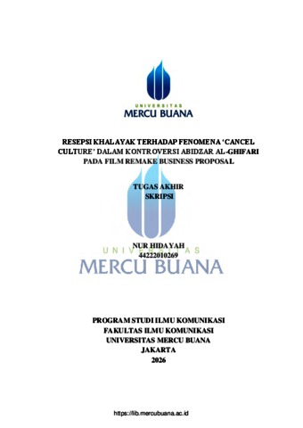 HIDAYAH, NUR (2026) RESEPSI KHALAYAK TERHADAP FENOMENA 'CANCEL CULTURE' DALAM KONTROVERSI ABIDZAR AL-GHIFARI PADA FILM REMAKE BUSINESS PROPOSAL. S1 thesis, Universitas Mercu Buana Jakarta.