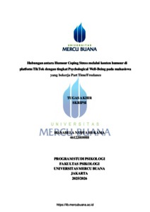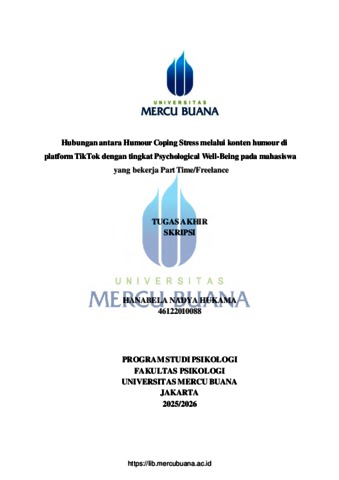 HUKAMA, HANABELA NADYA (2025) HUBUNGAN ANTARA HUMOUR COPING STRESS MELALUI KONTEN HUMOUR DI PLATFORM TIKTOK DENGAN TINGKAT PSYCHOLOGICAL WELL-BEING PADA MAHASISWA YANG BEKERJA PART TIME/FREELANCE. S1 thesis, Universitas Mercu Buana Jakarta.