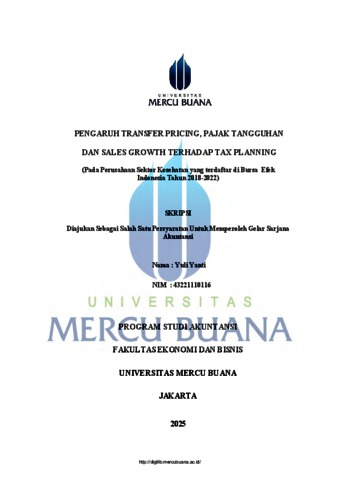 YANTI, YULI (2025) PENGARUH TRANSFER PRICING, PAJAK TANGGUHAN DAN SALES GROWTH TERHADAP TAX PLANNING (Pada Perusahaan Sektor Kesehatan yang terdaftar di Bursa Efek Indonesia Tahun 2018-2022). S1 thesis, UNIVERISTAS MERCU BUANA - BUNCIT.
