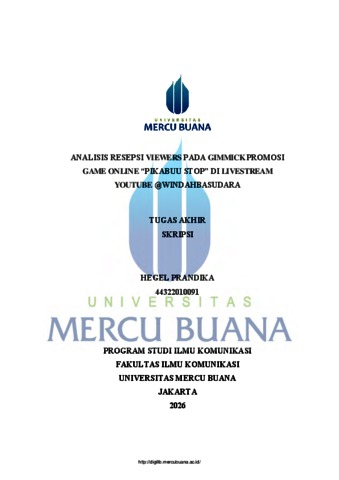 PRANDIKA, HEGEL (2026) ANALISIS RESEPSI VIEWERS PADA GIMMICK PROMOSI GAME ONLINE “PIKABUU STOP” DI LIVESTREAM YOUTUBE @WINDAHBASUDARA. S1 thesis, UNIVERISTAS MERCU BUANA - BUNCIT.
