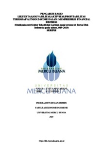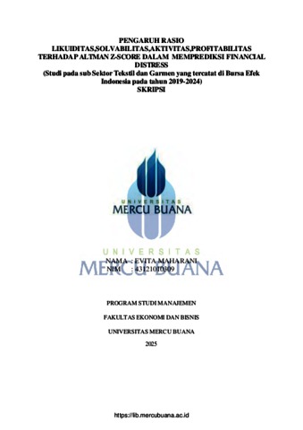 MAHARANI, EVITA (2025) PENGARUH RASIO LIKUIDITAS,SOLVABILITAS,AKTIVITAS,PROFITABILITAS TERHADAP ALTMAN Z-SCORE DALAM MEMPREDIKSI FINANCIAL DISTRESS (Studi pada sub Sektor Tekstil dan Garmen yang tercatat di Bursa Efek Indonesia pada tahun 2019-2024). S1 thesis, Universitas Mercu Buana Jakarta.