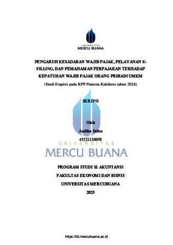SALIM, ANDIKA (2025) PENGARUH KESADARAN WAJIB PAJAK, PELAYANAN E-FILLING, DAN PEMAHAMAN PERPAJAKAN TERHADAP KEPATUHAN WAJIB PAJAK ORANG PRIBADI UMKM (Studi Empiris pada KPP Pratama Kalideres tahun 2024). S1 thesis, Universitas Mercu Buana Jakarta.