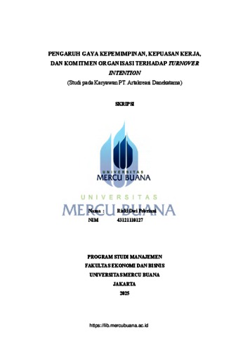 PEBRIANI, RISKI DWI (2025) PENGARUH GAYA KEPEMIMPINAN, KEPUASAN KERJA, DAN KOMITMEN ORGANISASI TERHADAP TURNOVER INTENTION (Studi pada Karyawan PT. Artakreasi Danekatama). S1 thesis, Universitas Mercu Buana Jakarta.