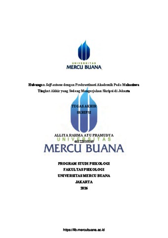 PRAMUDYA, ALLIYA RAHMA AYU (2026) HUBUNGAN SELF-ESTEEM DENGAN PROKRASTINASI AKADEMIK PADA MAHASISWA TINGKAT AKHIR YANG SEDANG MENGERJAKAN SKRIPSI DI JAKARTA. S1 thesis, Universitas Mercu Buana Jakarta.