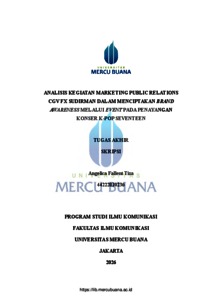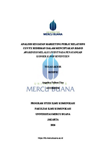 TIZA, ANGELICA FALLENT (2026) ANALISIS KEGIATAN MARKETING PUBLIC RELATIONS CGV FX SUDIRMAN DALAM MENCIPTAKAN BRAND AWARENESS MELALUI EVENT PADA PENAYANGAN KONSER K-POP SEVENTEEN. S1 thesis, Universitas Mercu Buana Jakarta.