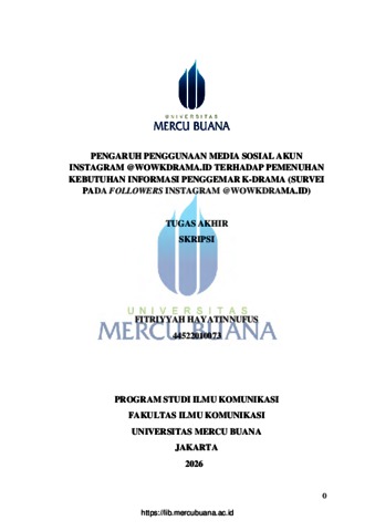 HAYATINNUFUS, FITRIYYAH (2026) PENGARUH PENGGUNAAN MEDIA SOSIAL AKUN INSTAGRAM @WOWKDRAMA.ID TERHADAP PEMENUHANKEBUTUHAN INFORMASI PENGGEMAR K-DRAMA (SURVEI PADA FOLLOWERS INSTAGRAM @WOWKDRAMA.ID). S1 thesis, Universitas Mercu Buana Jakarta.