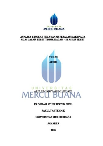 ILMIANSYAH S, AZIZ (2026) ANALISA TINGKAT PELAYANAN PEJALAN KAKI PADA RUAS JALAN TEBET TIMUR DALAM - STASIUN TEBET. S1 thesis, UNIVERISTAS MERCU BUANA - BUNCIT.