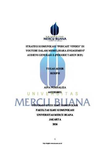 NURHALIZA, AINA (2026) STRATEGI KOMUNIKASI “PODCAST VINDES” DI YOUTUBE DALAM MEMELIHARA ENGAGEMENT AUDIENS GENERASI Z (PERIODE TAHUN 2025). S1 thesis, UNIVERISTAS MERCU BUANA - BUNCIT.