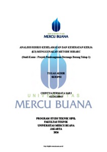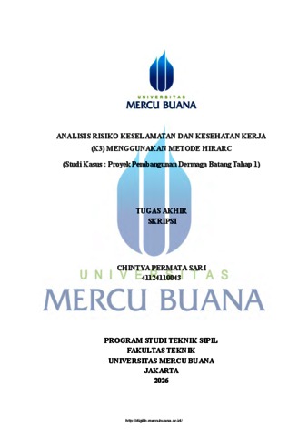 PERMATA SARI, CHINTYA (2026) ANALISIS RISIKO KESELAMATAN DAN KESEHATAN KERJA (K3) MENGGUNAKAN METODE HIRARC (Studi Kasus : Proyek Pembangunan Dermaga Batang Tahap 1). S1 thesis, UNIVERISTAS MERCU BUANA - BUNCIT.