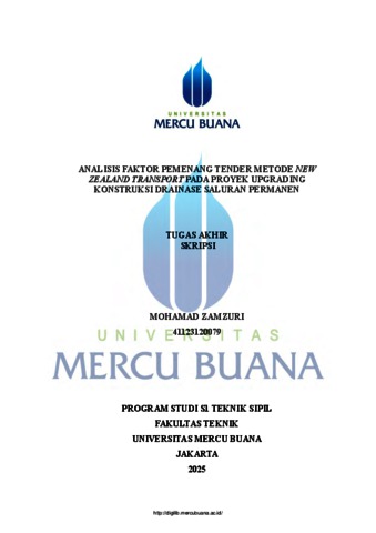 ZAMZURI, MOHAMAD (2026) ANALISIS FAKTOR PEMENANG TENDER METODE NEW ZEALAND TRANSPORT PADA PROYEK UPGRADING KONSTRUKSI DRAINASE SALURAN PERMANEN. S1 thesis, UNIVERISTAS MERCU BUANA - BUNCIT.