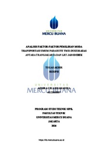 RHAMADINA, AZHIRA CIKA (2026) ANALISIS FAKTOR-FAKTOR PEMILIHAN MODA TRANSPORTASI UMUM PADA RUTE TMII-DUKUH ATAS ANTARA TRANSJAKARTA DAN LRT JABODEBEK. S1 thesis, Universitas Mercu Buana Jakarta.