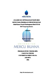 SUSANTO, WAWAN (2026) ANALISIS DAN OPTIMALISASI WASTE BESI BETON PADA PEKERJAAN STRUKTUR BAWAH (Studi Kasus: Proyek Pembangunan Hotel XYZ di BSD Tangerang Banten). S1 thesis, Universitas Mercu Buana Jakarta.