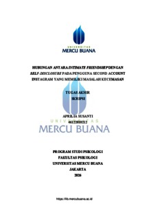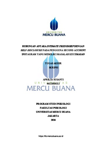 SUSANTI, APRILIA (2026) HUBUNGAN ANTARA INTIMATE FRIENDSHIP DENGAN SELF-DISCLOSURE PADA PENGGUNA SECOND ACCOUNT INSTAGRAM YANG MEMILIKI MASALAH KECEMASAN. S1 thesis, Universitas Mercu Buana Jakarta.