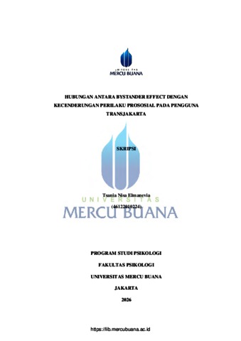 ELMANEVIA, TSANIA NISA (2026) HUBUNGAN ANTARA BYSTANDER EFFECT DENGAN KECENDERUNGAN PERILAKU PROSOSIAL PADA PENGGUNA TRANSJAKARTA. S1 thesis, Universitas Mercu Buana Jakarta.
