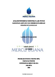 ASTUTY, NINDY (2026) ANALISIS PENERBITAN SERTIFIKAT LAIK FUNGSI BANGUNAN AGEN LPG 3 KG SUBSIDI KOTA BEKASI PERSPEKTIF KONSULTAN. S1 thesis, UNIVERISTAS MERCU BUANA - BUNCIT.