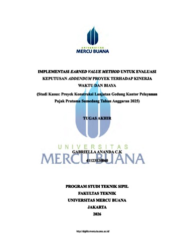 Ananda C.K, Gabriella (2026) IMPLEMENTASI EARNED VALUE METHOD UNTUK EVALUASI KEPUTUSAN ADDENDUM PROYEK TERHADAP KINERJA WAKTU DAN BIAYA (studi kasus: Proyek Konstruksi Lanjutan Gedung Kantor Pelayanan Pajak Pratama Sumedang Tahun Anggaran 2025). S1 thesis, UNIVERISTAS MERCU BUANA - BUNCIT.