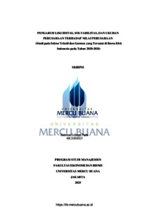 PURBA, REBECCA SEFANYA (2025) PENGARUH LIKUIDITAS, SOLVABILITAS, DAN UKURAN PERUSAHAAN TERHADAP NILAI PERUSAHAAN (Studi pada Sektor Tekstil dan Garmen yang Tercatat di Bursa Efek Indonesia pada Tahun 2020-2024). S1 thesis, Universitas Mercu Buana Jakarta.