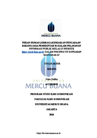 ZALIKA, GITTA (2026) PERAN HUMAS LEMBAGA KEBIJAKAN PENGADAAN BARANG/JASA PEMERINTAH RI DALAM PELAYANAN INFORMASI PUBLIK MELALUI WEBSITE https://ppid.lkpp.go.id/ DALAM PRESPEKTIF KEPUASAN MASYARAKAT. S1 thesis, Universitas Mercu Buana Jakarta.