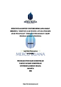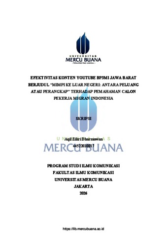 DHARMAWAN, AQIL ZIKRI (2026) EFEKTIVITAS KONTEN YOUTUBE BP3MI JAWA BARAT BERJUDUL "MIMPI KE LUAR NEGERI: ANTARA PELUANG ATAU PERANGKAP" TERHADAP PEMAHAMAN CALON PEKERJA MIGRAN INDONESIA. S1 thesis, Universitas Mercu Buana Jakarta.
