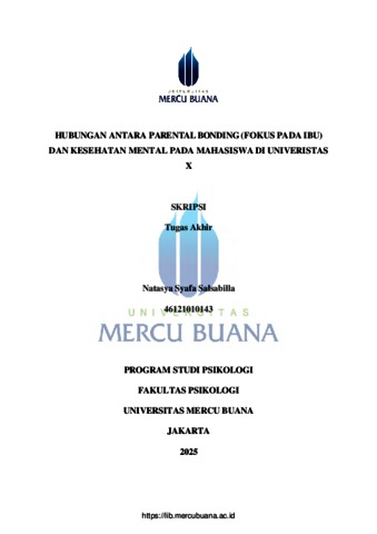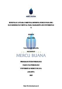 SALSABILLA, NATASYA SYAFA (2025) HUBUNGAN ANTARA PARENTAL BONDING (FOKUS PADA IBU) DAN KESEHATAN MENTAL PADA MAHASISWA DI UNIVERISTAS X. S1 thesis, Universitas Mercu Buana Jakarta.
