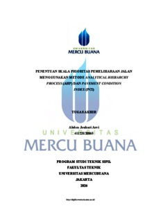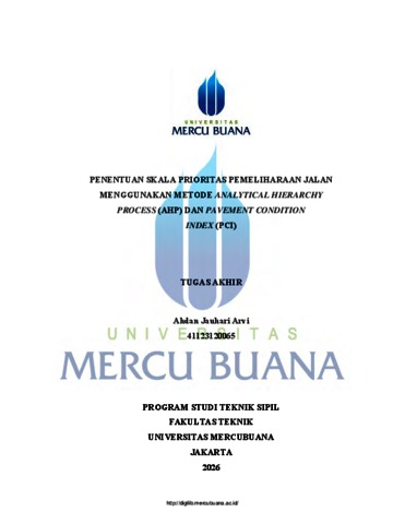 ARVI, AHDAN JAUHARI (2026) PENENTUAN SKALA PRIORITAS PEMELIHARAAN JALAN MENGGUNAKAN METODE ANALYTICAL HIERARCHY PROCESS (AHP) DAN PAVEMENT CONDITION INDEX (PCI). S1 thesis, UNIVERISTAS MERCU BUANA - BUNCIT.