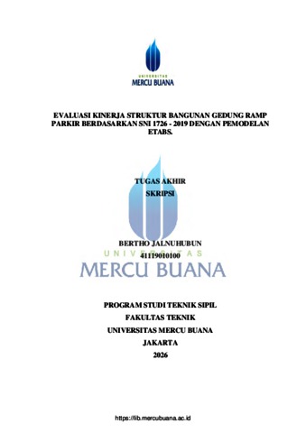 JALNUHUBUN, BERTHO (2026) EVALUASI KINERJA STRUKTUR BANGUNAN GEDUNG RAMP PARKIR BERDASARKAN SNI 1726 - 2019 DENGAN PEMODELAN ETABS. S1 thesis, Universitas Mercu Buana Jakarta.