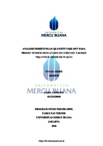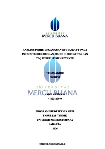KHANSA, NABILA (2026) ANALISIS PERHITUNGAN QUANTITY TAKE OFF PADA PROSES TENDER DENGAN BIM 5D CUBICOST TAS DAN TBQ UNTUK EFISIENSI WAKTU. S1 thesis, Universitas Mercu Buana Jakarta.
