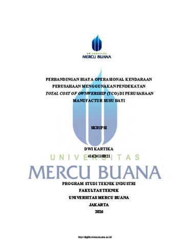 KARTIKA, DWI (2022) PERBANDINGAN BIAYA OPERASIONAL KENDARAAN PERUSAHAAN MENGGUNAKAN PENDEKATAN TOTAL COST OF OWNWERSHIP (TCO) DI PERUSAHAAN MANUFACTUR SUSU BAYI. S1 thesis, UNIVERISTAS MERCU BUANA - BUNCIT.