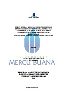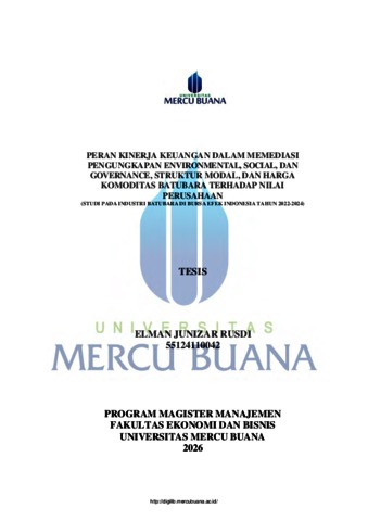 RUSDI, ELMAN JUNIZAR (2026) PERAN KINERJA KEUANGAN DALAM MEMEDIASI PENGUNGKAPAN ENVIRONMENTAL, SOCIAL, DAN GOVERNANCE, STRUKTUR MODAL, DAN HARGA KOMODITAS BATUBARA TERHADAP NILAI PERUSAHAAN (STUDI PADA INDUSTRI BATUBARA DI BURSA EFEK INDONESIA TAHUN 2022-2024). S2 thesis, UNIVERISTAS MERCU BUANA - BUNCIT.