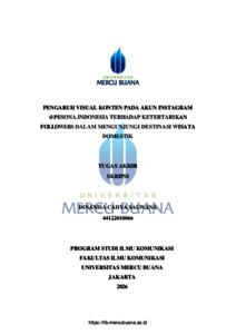 Salwana, Dinanisa Cahya (2026) PENGARUH VISUAL KONTEN PADA AKUN INSTAGRAM @PESONA.INDONESIA TERHADAP KETERTARIKAN FOLLOWERS DALAM MENGUNJUNGI DESTINASI WISATA DOMESTIK. S1 thesis, Universitas Mercu Buana Jakarta.