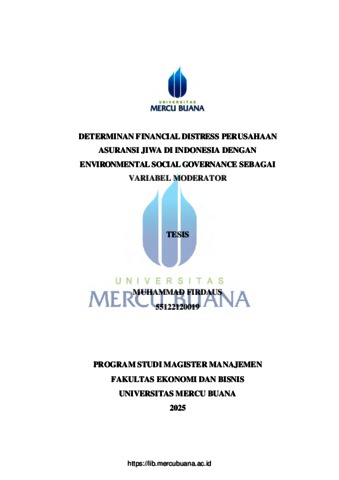 FIRDAUS, MUHAMMAD (2025) DETERMINAN FINANCIAL DISTRESS PERUSAHAAN ASURANSI JIWA DI INDONESIA DENGAN ENVIRONMENTAL SOCIAL GOVERNANCE SEBAGAI VARIABEL MODERATOR. S2 thesis, Universitas Mercu Buana Jakarta.