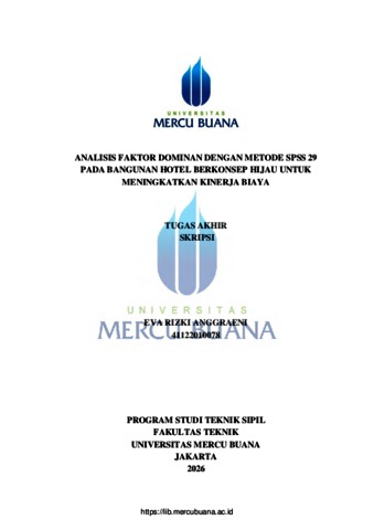 ANGGRAENI, EVA RIZKI (2026) ANALISIS FAKTOR DOMINAN DENGAN METODE SPSS 29 PADA BANGUNAN HOTEL BERKONSEP HIJAU UNTUK MENINGKATKAN KINERJA BIAYA. S1 thesis, Universitas Mercu Buana Jakarta.